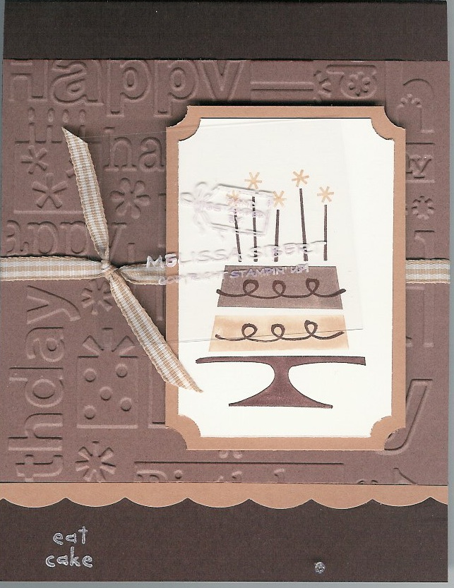 IT'S HERE! IT'S HERE! It was almost like Christmas yesterday when I went to get the mail. I had three things in there from Stampin' UP!, one of which was my new catalog. I stayed up till 11:15 last night looking over it, picking out what I wanted to put on my wish list, etc. I think it is a beautiful catalog. Lots of wonderful color combos (my favorite is the groovy guava, ruby red, river rock combo. So beautiful.), soft spring and summer colors, and bold bright kids colors.